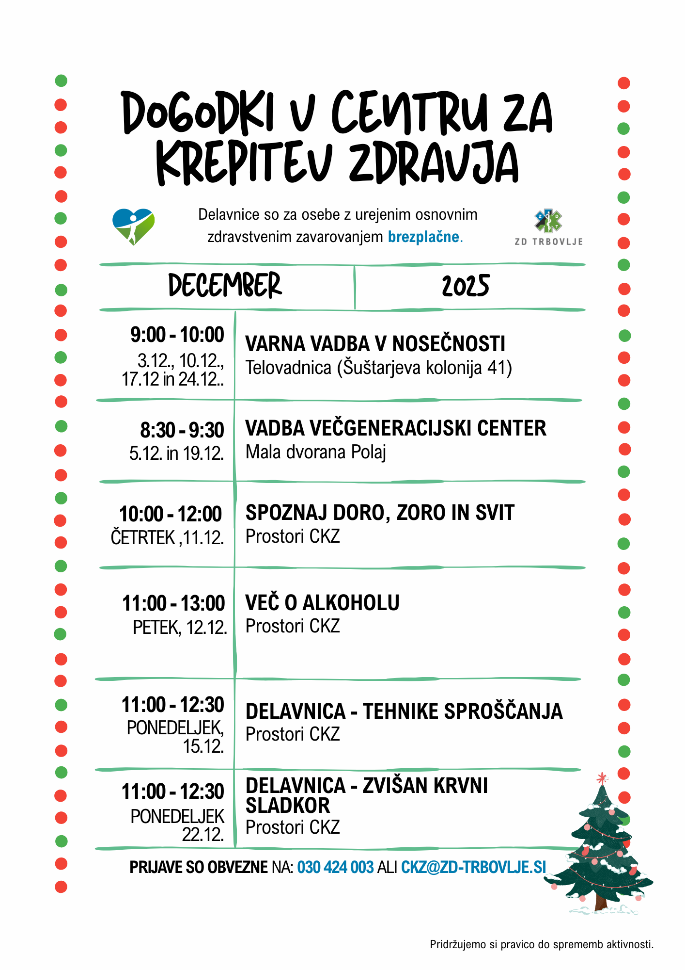 Za udeležbo na dogodkih je obvezna prijava, kar lahko uredite kar po telefonu na: 030 424 003 ali pa po mailu ckz@zd-trbovlje.si